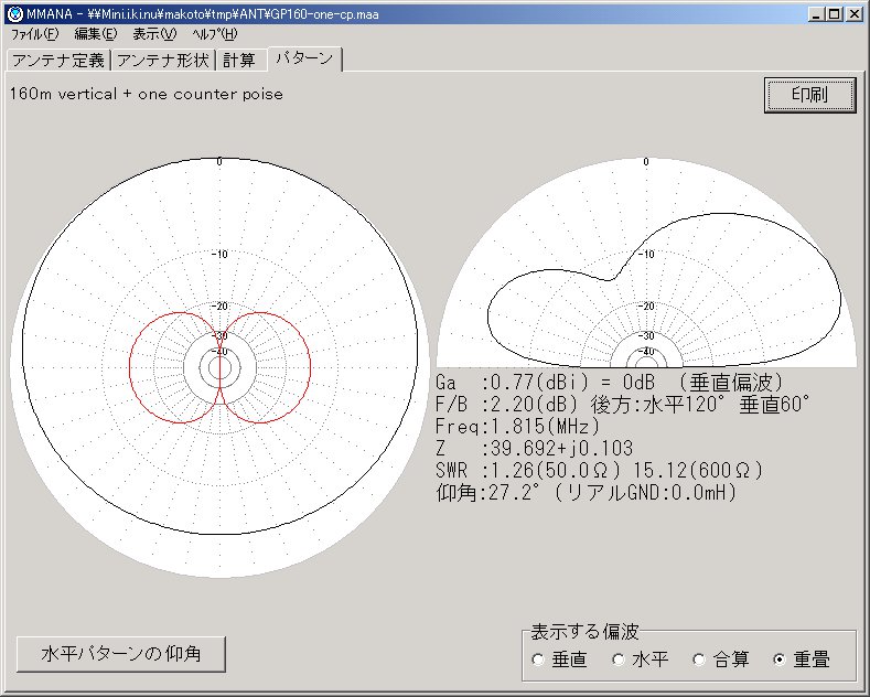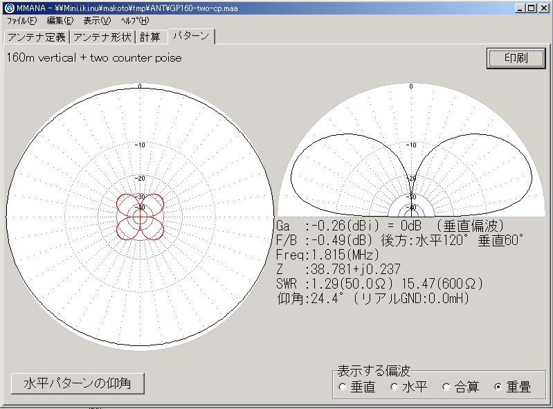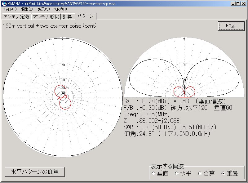 垂直一本、カウンタポイズ二本(折曲)、実接地 (real ground), ground screen 無