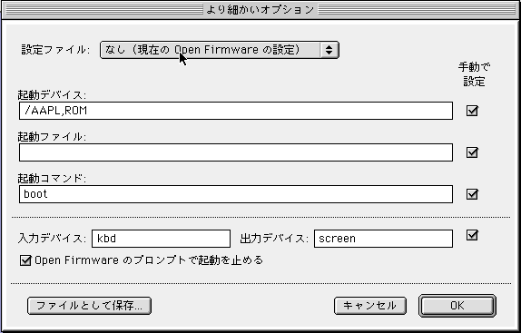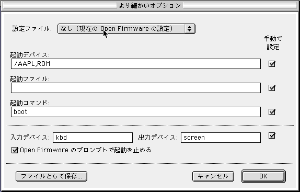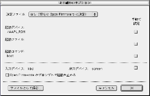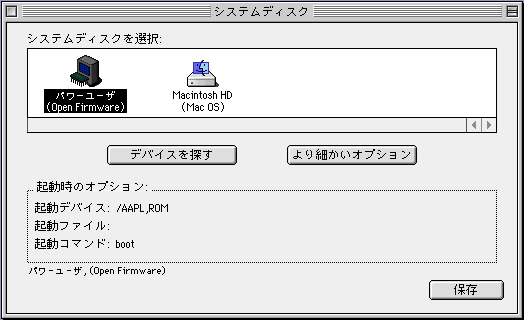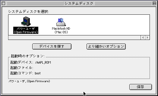 ここで 「保存」を選ぶと、内容が Open Firmware の変数として NVRAM に書込まれます。 終了 (command + q) してから、再起動します。 |