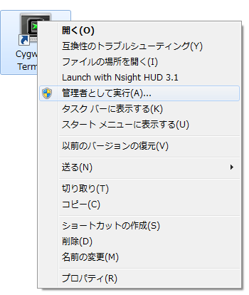 僕の理解の範囲では、Cygwin terminal では気軽に sudo 出来ないので、 管理者権限が必要な操作は、上のように Cygwin terminal のアイコンから、右クリックで、 表示される中の 「管理者として実行(A)...」を選んで起動します。
